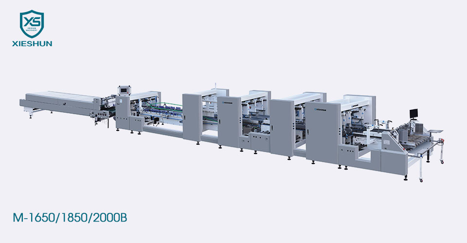 China Xieshun M-1650/1850/2000b Автоматична важка гофрована папка для гофрованого блокування Gluer, використовуйте PLC та імпортовані електронні компоненти, подача з незалежним сервомоторним двигуном, внутрішні пластини переміщуються за допомогою лінійних путівників для забезпечення точності та простоти роботи.